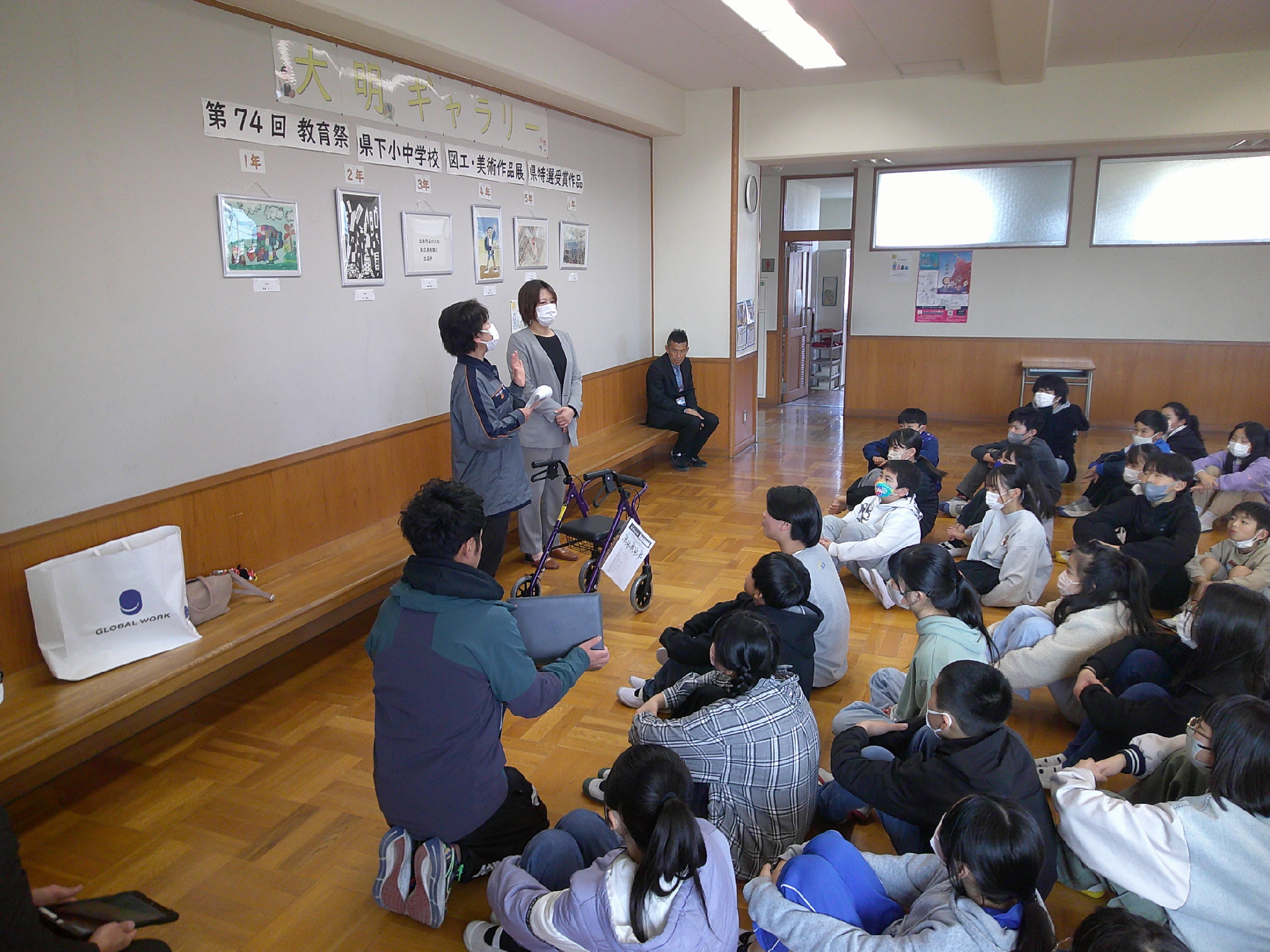 そして今日、センターの皆さんがいらっしゃって、実際に購入した歩行器がどのようなものなのか、児童みんなに説明してくださいました。ミニ集会「大明ショート」の時間を使い、オンライン会議方式で、各クラスで児童は視聴しました。歩行器は、高齢者の方が歩くための訓練をしたり、弱ってしまった足腰をサポートしたりするために活用するそうです。