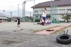 小学校6年生が参加する陸上記録会が10月に開かれます。そこで、陸上部の中学生の皆さんに先生になっていただき、6年生が陸上競技を教わることになったのです。よい機会なので、落合小・南湖小の6年生も一緒に教わることになりました。(甲西中・大明小・落合小・南湖小の4つの学校は、小中一貫校として、いろいろな行事などで一緒に活動に取り組んでいます。)