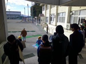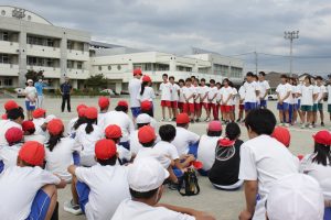 5・6校時、大明小学校の校庭に小学生と中学生が集合しました。