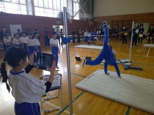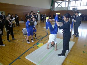 ロンダートや側方倒立回転などの技にグループで取り組んだり、どうすれば上手に技ができるのかお互いにアドバイスし合ったりする姿が見られました。